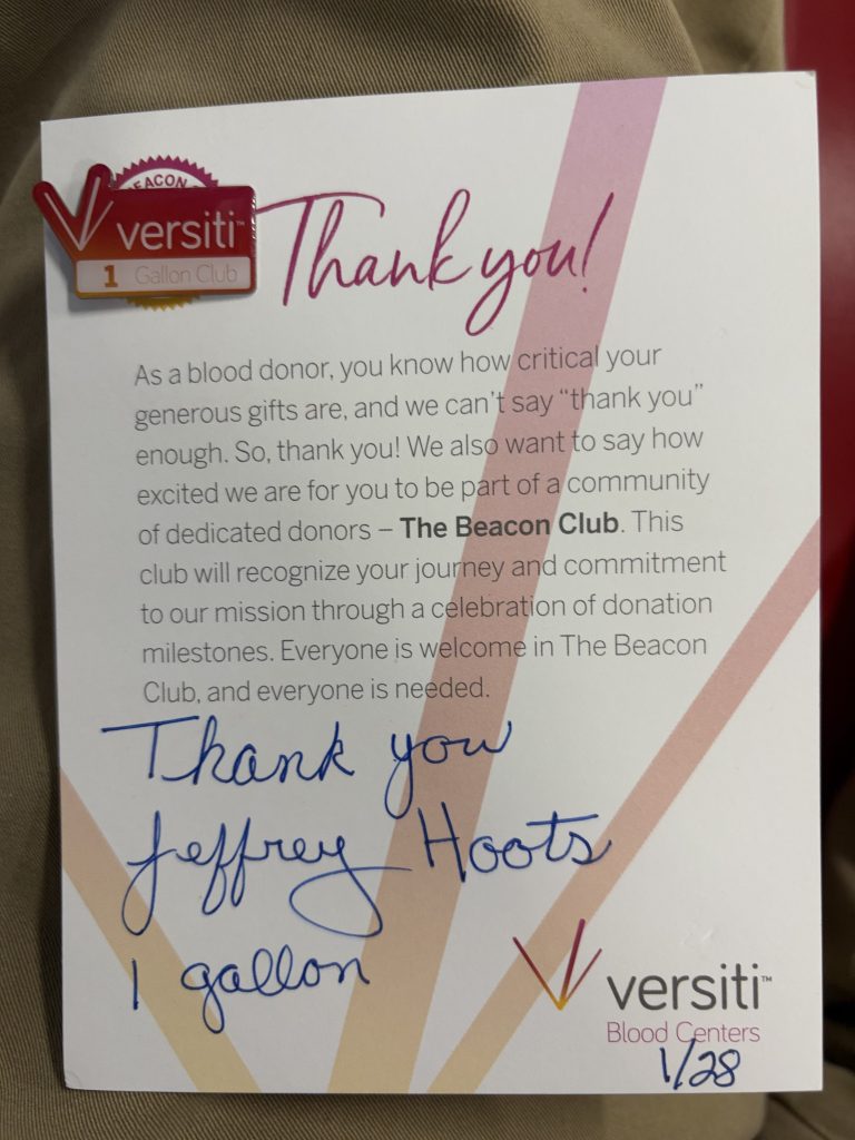 My first blood donation was in 1985 at my university’s Red Cross blood drive, peer pressure at its finest – thanks Jon! Instead of returning the favor, perhaps “preturning” the favor? Since then my motivation has been cyclical. The organization where I live that coordinates donations and distributions has been keeping track and I’ve finally finished my eighth donation – one gallon!